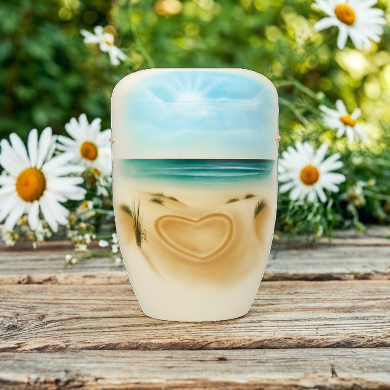 Unsere schöne Naturfaser- Urne mit Motiv Düne und dem Herz ist eine schöne Idee für alle, die das Meer so geliebt haben.