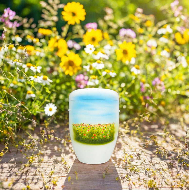In dieser Urne vereinen sich Erde und Himmel – Sinnbilder für Abschied und Neubeginn. Die bunten Wiesenblumen erinnern an die Schönheit des Lebens, an sonnige Tage und leise Momente des Glücks. Der weite Himmel darüber steht für Freiheit, Frieden und das Gefühl, dass jede Seele ihren Weg findet.