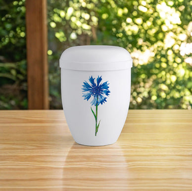 Naturfaserurne, mattweiß, Kornblume aus biol. abbaub. Komponenten geeignet für Wälder, Friedhof.
